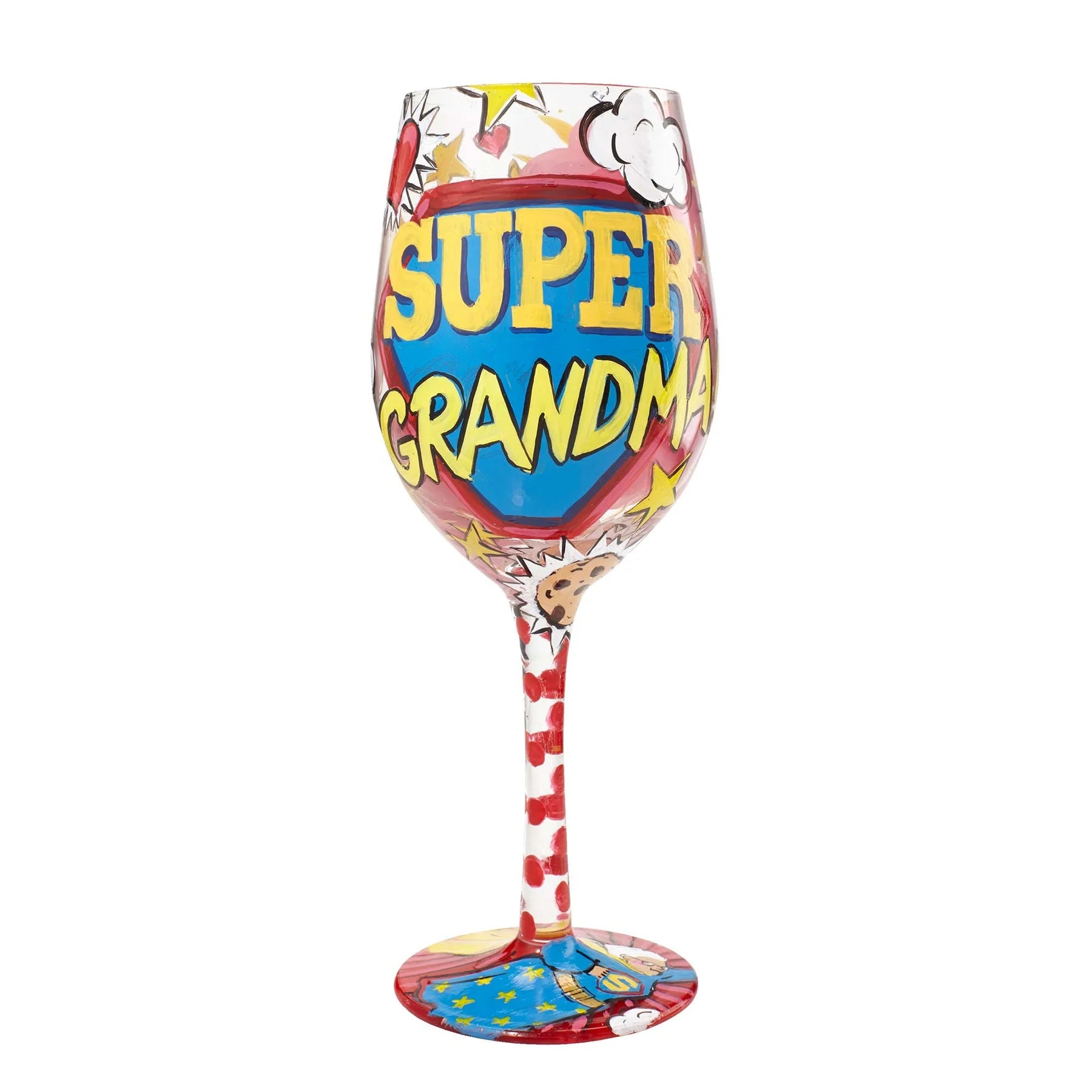 This Super Grandma Wine Glass features a playful, comic-style design and is adorned with bold, hand painted colours. Enjoy your favourite vintage in a fun way.