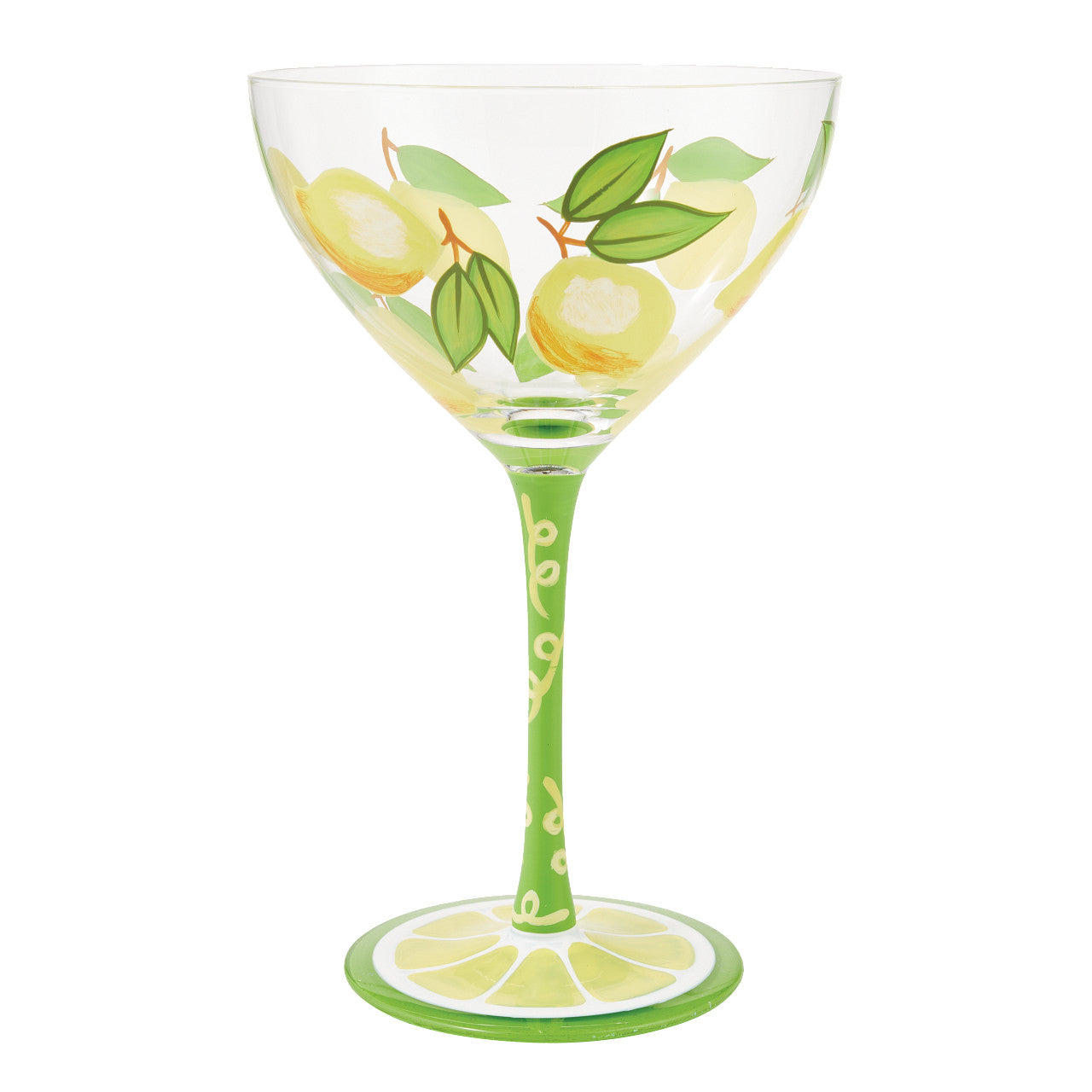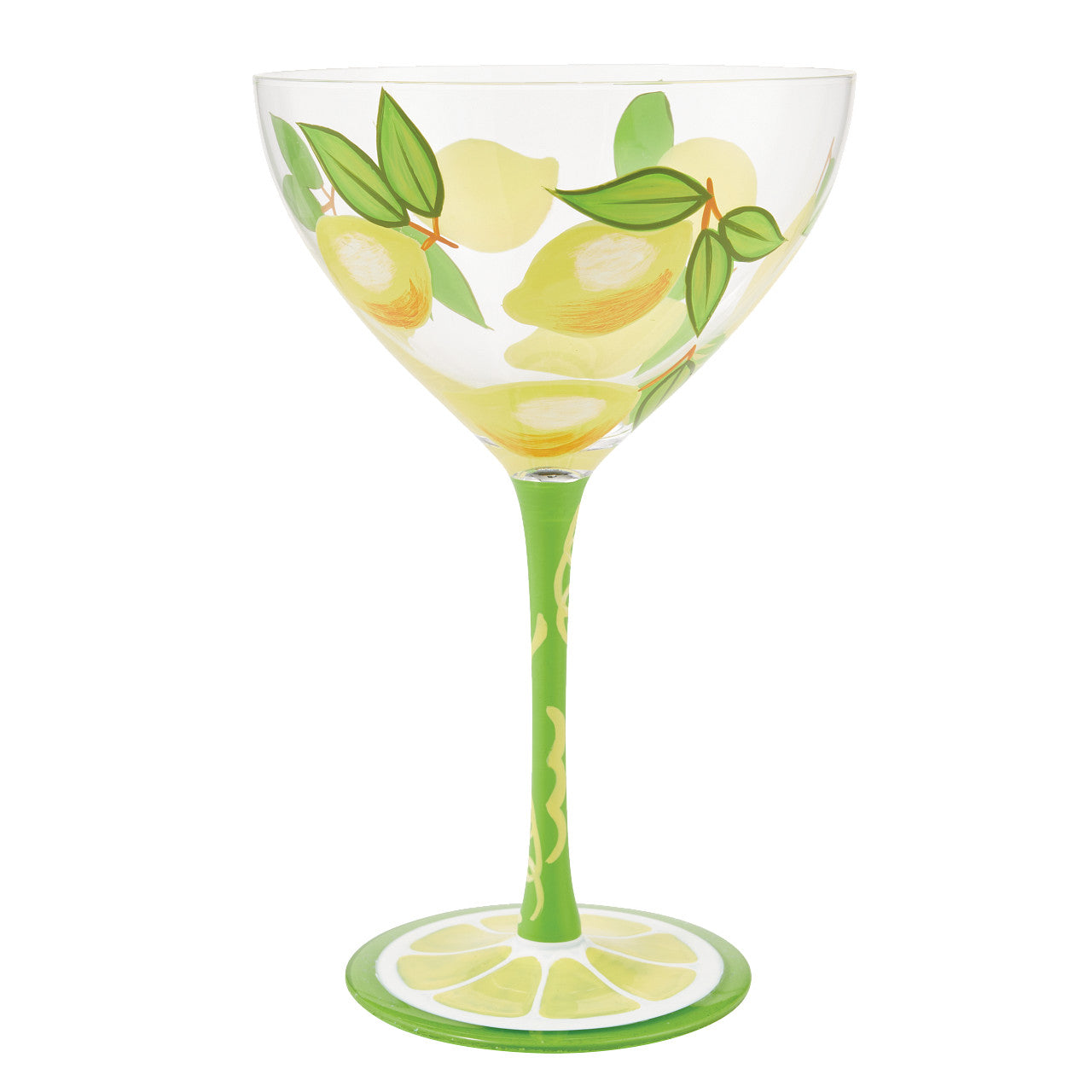 Delight your guests with this unique Lemon Drop Cocktail Glass. Hand painted with yellow lemons and featuring a cocktail recipe underneath, this glass is sure to be a conversation starter. Perfect for any dinner party or event.