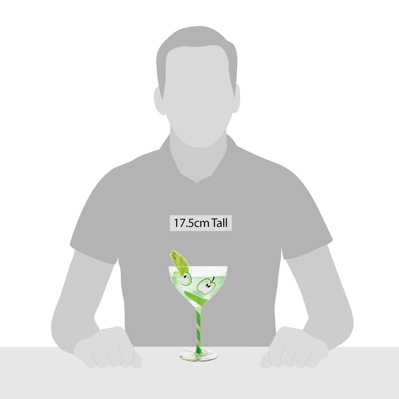 Celebrate Lolita's anniversary with our Appletini Cocktail Glass. A beautiful reminder of how Lolita first started Designs by Lolita. This particular modern design has apple's surrounding the whole glass with apple peel floating down the stem of the glass. A simple yet beautiful design to celebrate spring or summer. The cocktail recipe is beautifully printed on the underside of the base.