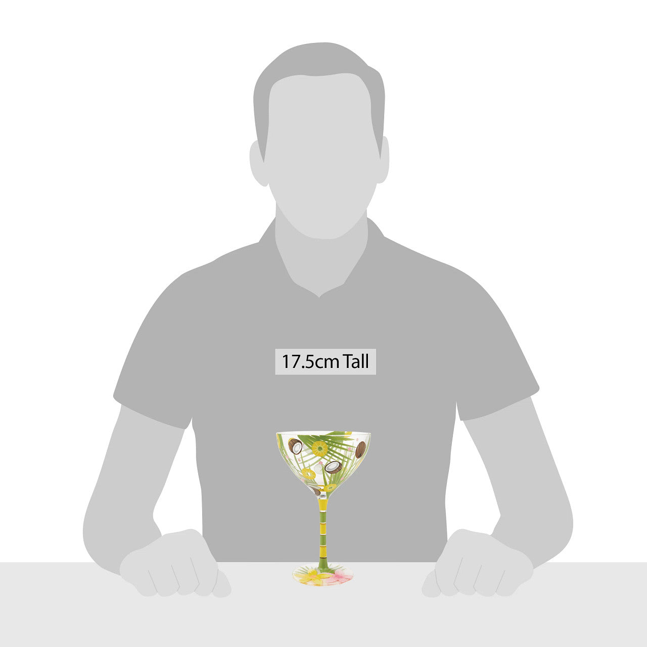 Sip a pina colada in style with this hand-painted cocktail glass. An intricate design of coconuts, flowers, and palm leaves gives this glass a unique tropical look. Each glass also includes a handy cocktail recipe underneath for your convenience. Enjoy your favorite tropical drink in elegant, rustic style.