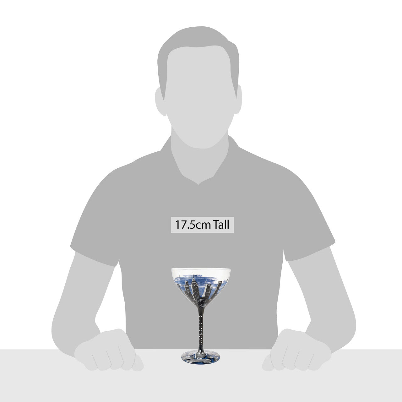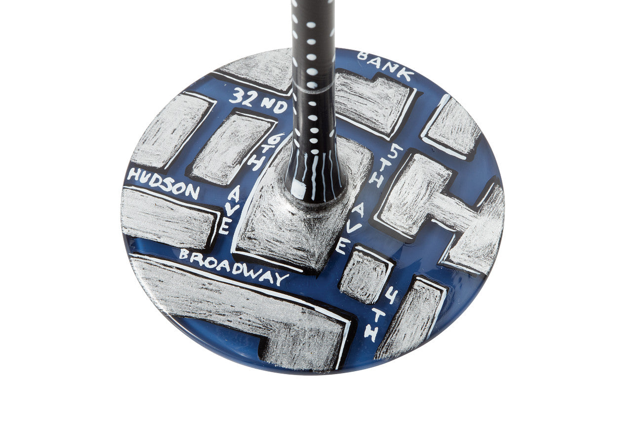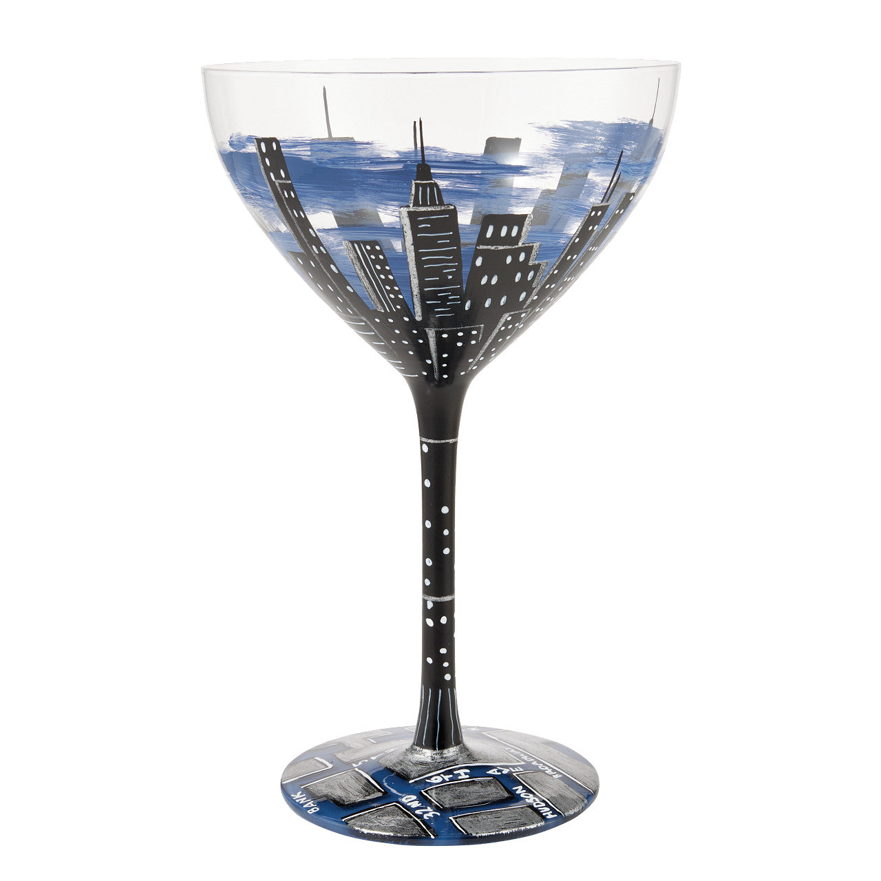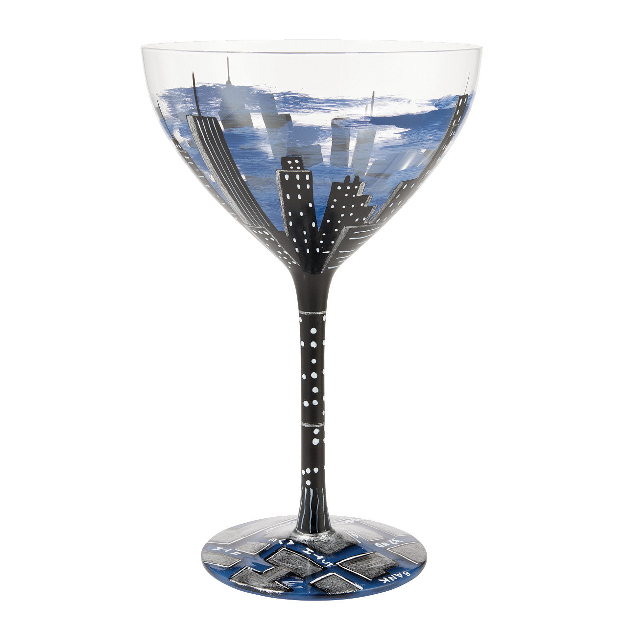 This hand-painted Manhattan Cocktail Glass is designed to bring an element of skyline to your home. With its unique different perspectives design, the midnight blue glass is sure to captivate your guests.