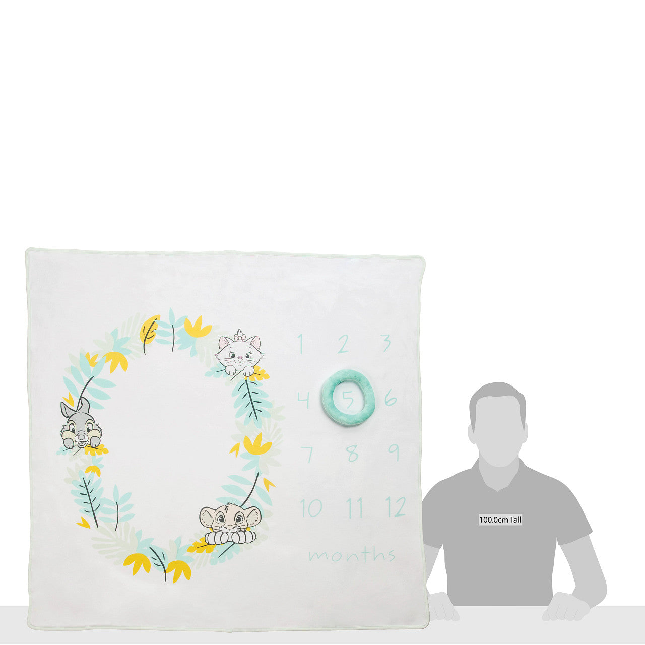 Celebrate each precious month of your littles ones' first year with this classic Disney milestone blanket. By surrounding your baby with Simba, Thumper and Marie you will be able to create a fun and adorable photoshoot and record each milestone. The reverse side with Dumbo and Simba is ideal for encouraging tummy time and makes a beautiful illustrated family heirloom. Made from 100% cotton ensures it is both cosy and gentle on the most delicate skin. Window box packaging allows this blanket to be the perfect baby shower gift for any parents-to-be. Enesco is proud to present its brand-new licensed Disney Baby Collection.