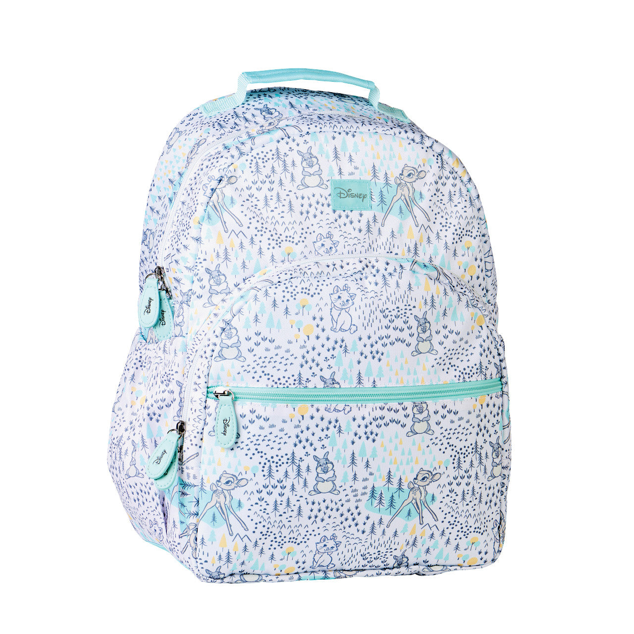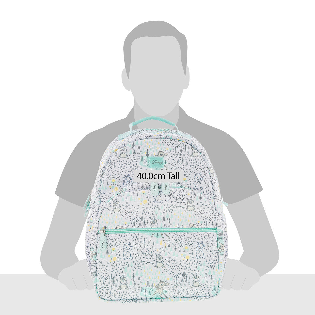 The classic Disney changing bag featuring Bambi, Thumper and Marie is perfect for trips out with or without baby. The gender-neutral backpack features a grab top handle, D-rings to attach to pram and elasticated side pockets for bottles. Several storage areas inside the bag allows you to carry all the essential everyday items you and your little one needs. Padded back and shoulder straps are added for your comfort. External zipped pockets make it safe for any valuables. Made from wipe clean, lightweight and sturdy polyester fabric. Enesco is proud to present its brand-new licensed Disney Baby Collection.