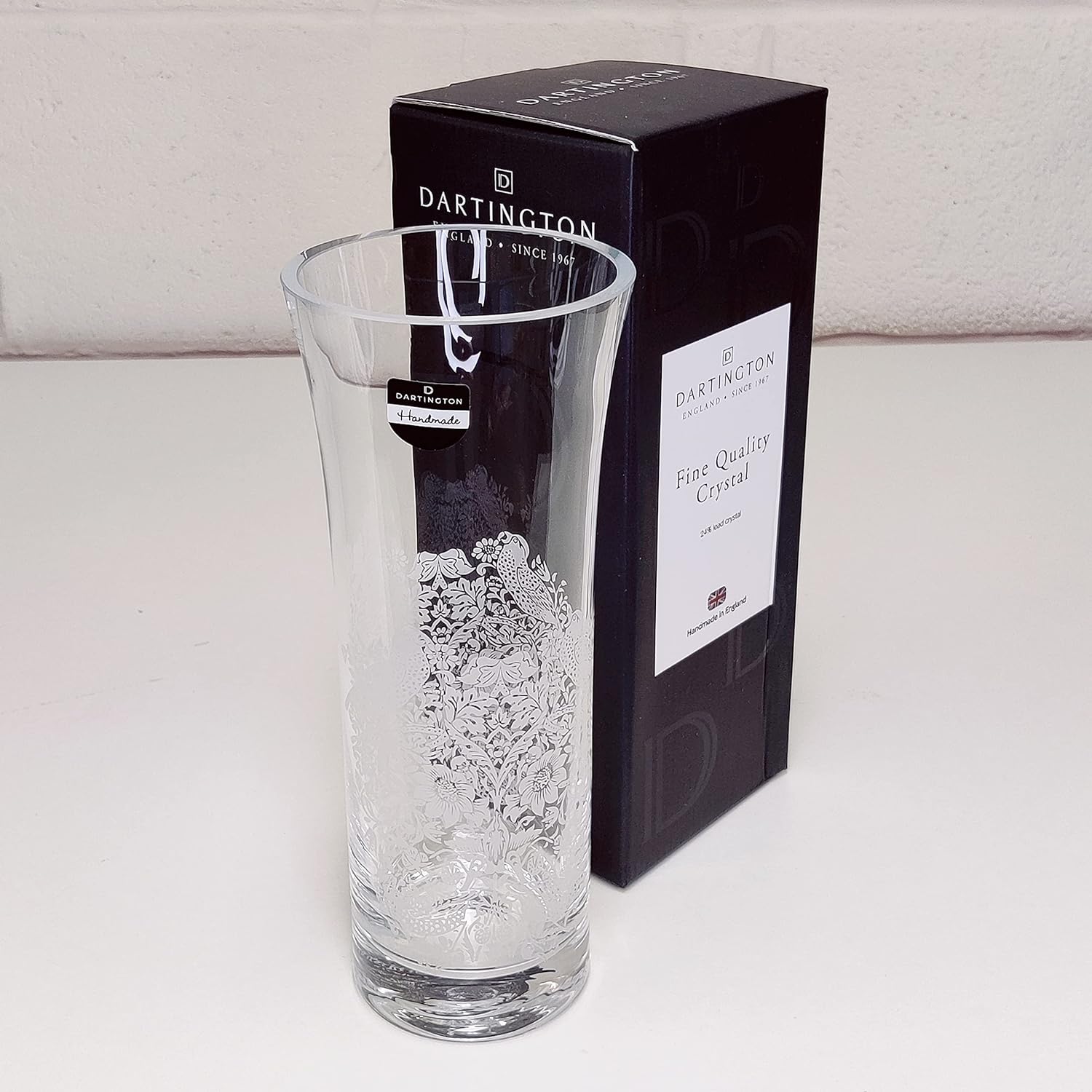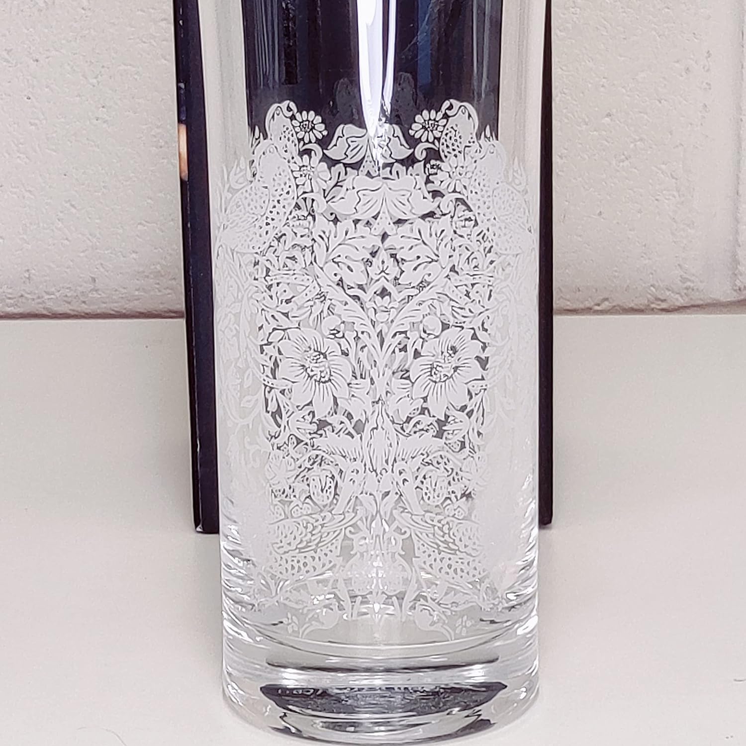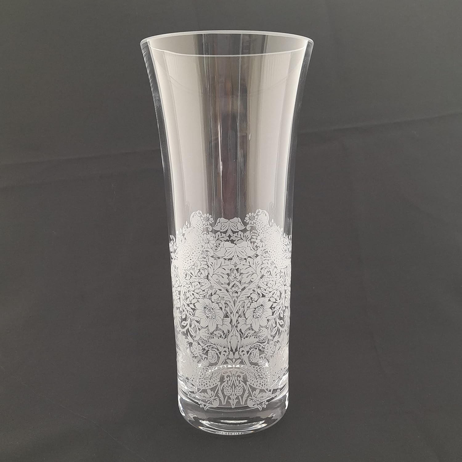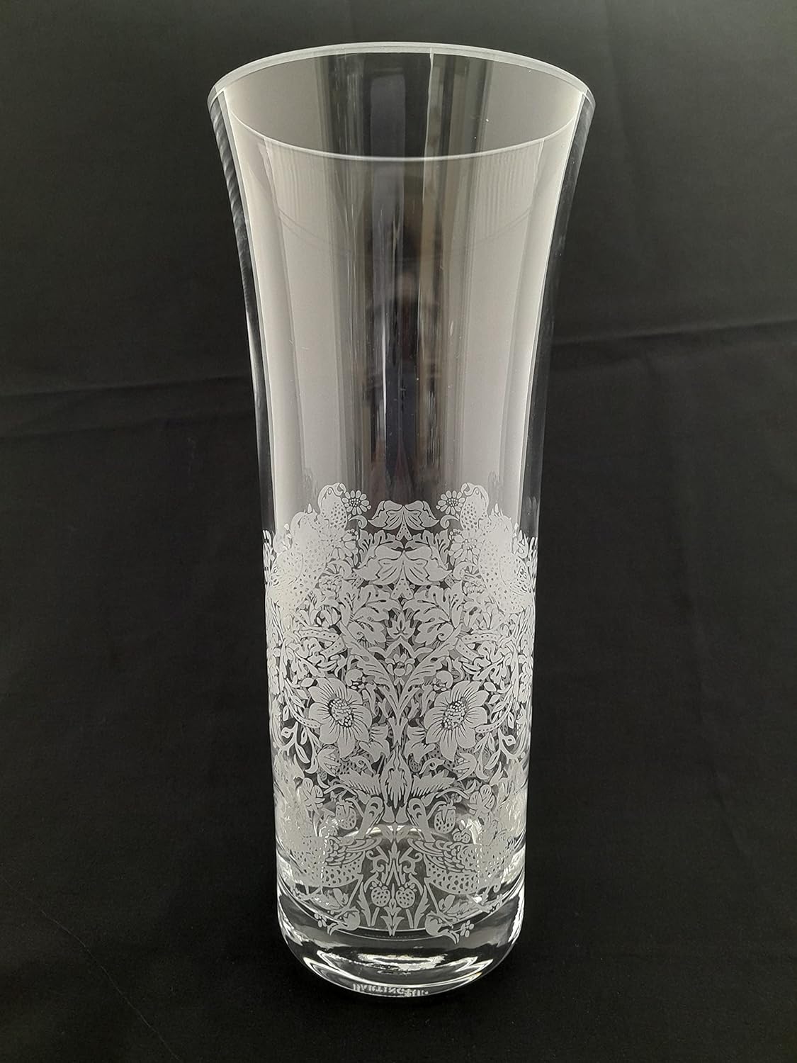 William Morris' Strawberry Thief Design is etched on this 24% lead crystal vase. This handmade vase is exclusive to Preshunt.