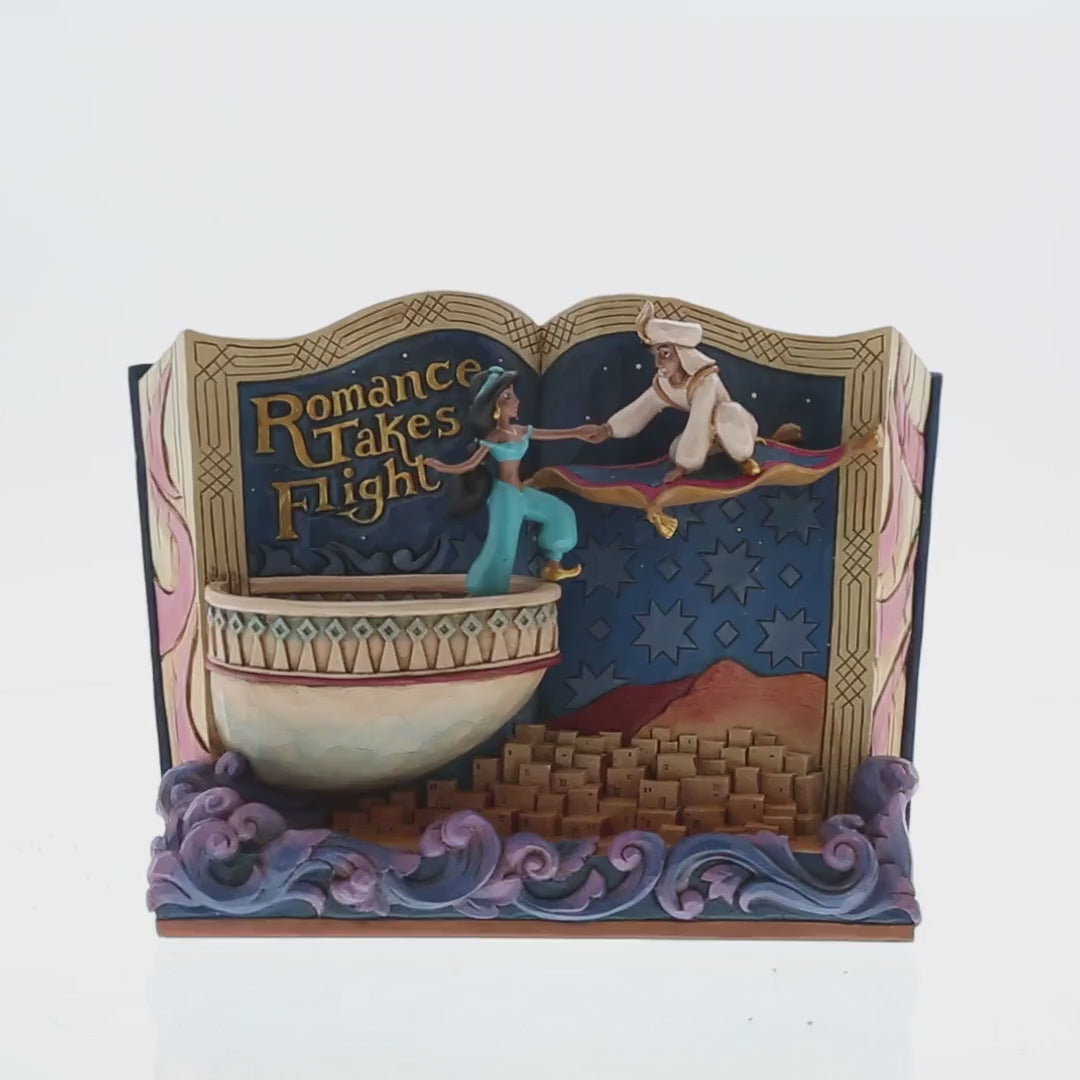Share a whole new world with Aladdin and Jasmine. Romance takes flight in this iconic scene, as they embark on a magic carpet ride and fall in love among the stars. Treasure their romantic tale with this splendid storybook designed by Jim Shore. The figurine is made from cast stone. Packed in a branded gift box. Unique variations should be expected as this product is hand painted. Not a toy or children's product. Intended for adults only.
