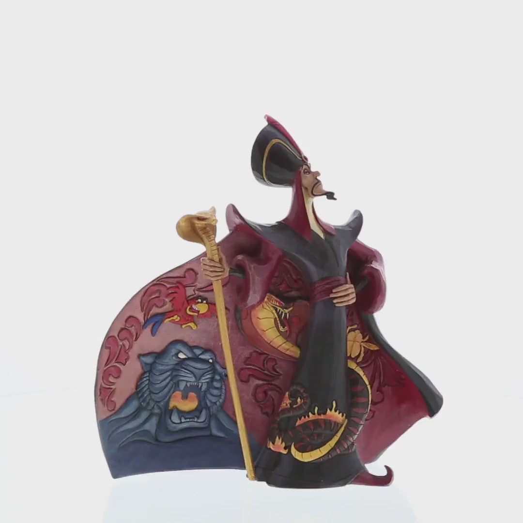 Jafar, Aladdin's greatest threat, looks quite formidable in this Jim Shore design. His cloak billowing, etched designs make the villain even more threatening. With a snake twisted around his garment, and blue tiger bearing it's fangs, fear meets fashion. Unique variations should be expected as this product is hand painted. Packed in a branded gift box. Not a toy or children's product. Intended for adults only.