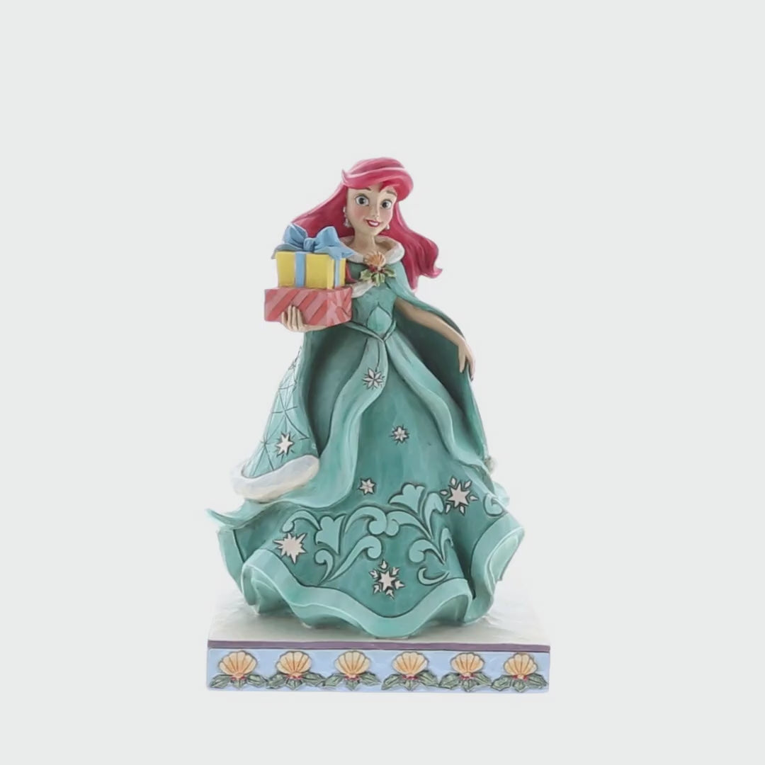"Gifts of Song" In a brilliant blue dress, Ariel is a vision of beauty and gratitude in this lovely Jim Shore statuette. Carrying gifts and wearing a broach of holly, the princess delivers presents to all those Under the Sea. Flounder and Sebastian grace the base. Hand painted and hand sculpted from high quality cast stone.