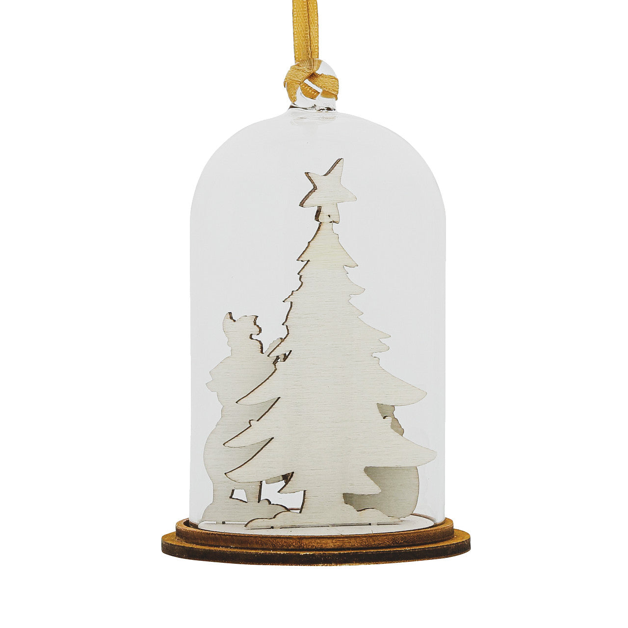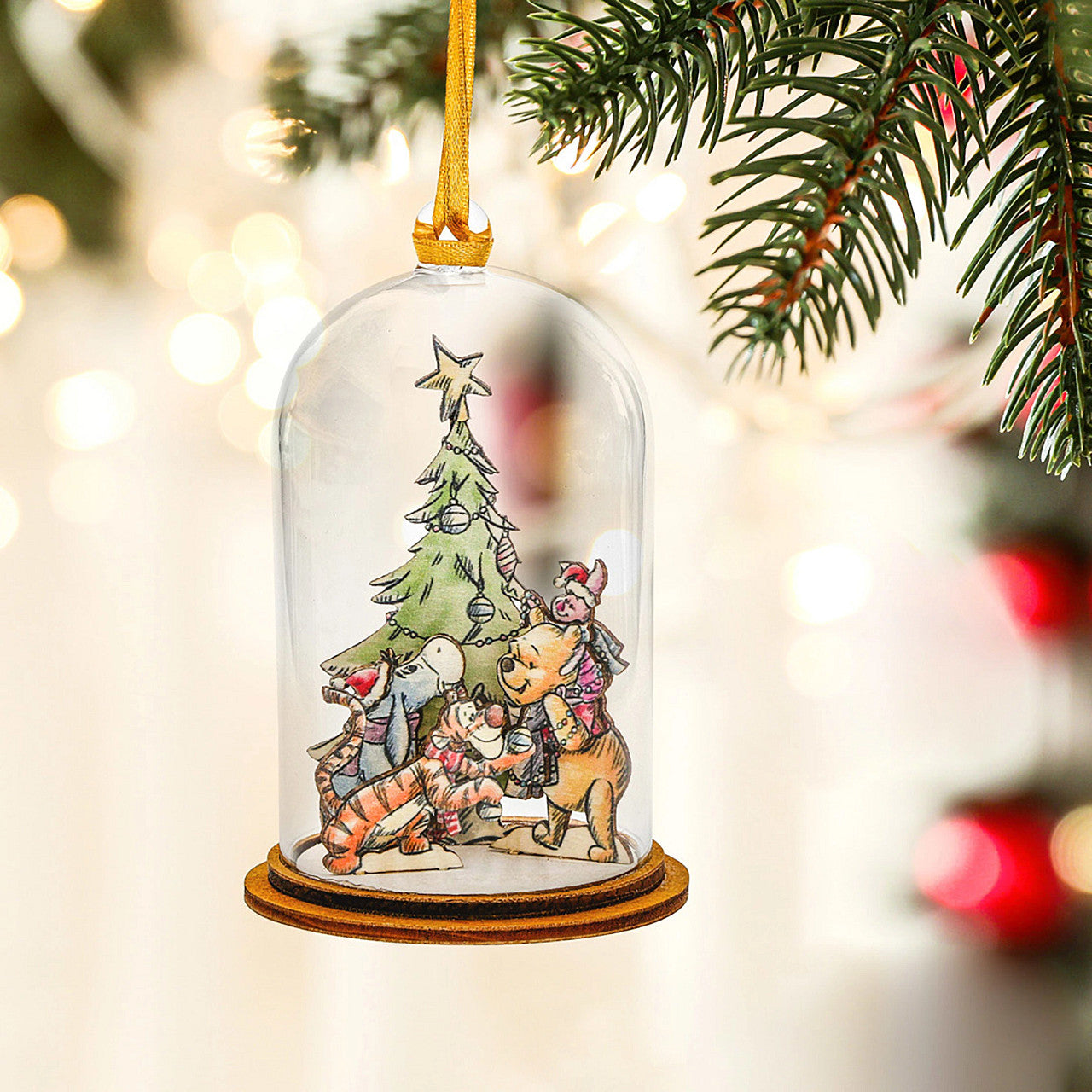 This delightful wooden decoration captures the magic of Disney at Christmas time. This glass dome, decoration encases all the gang from the 101 Arce Wood, including Eeyore, Tigger, Piglet and most importantly the SIlly Old Bear himself Winnie the Pooh. The gold ribbon feature allows you to hang this special ornament on your Christmas tree. This classic vintage style, decorative Kloche will make a stunning display in your home. Material: Glass with a wooden base. Packaging: Presented in a branded unique giftbox.