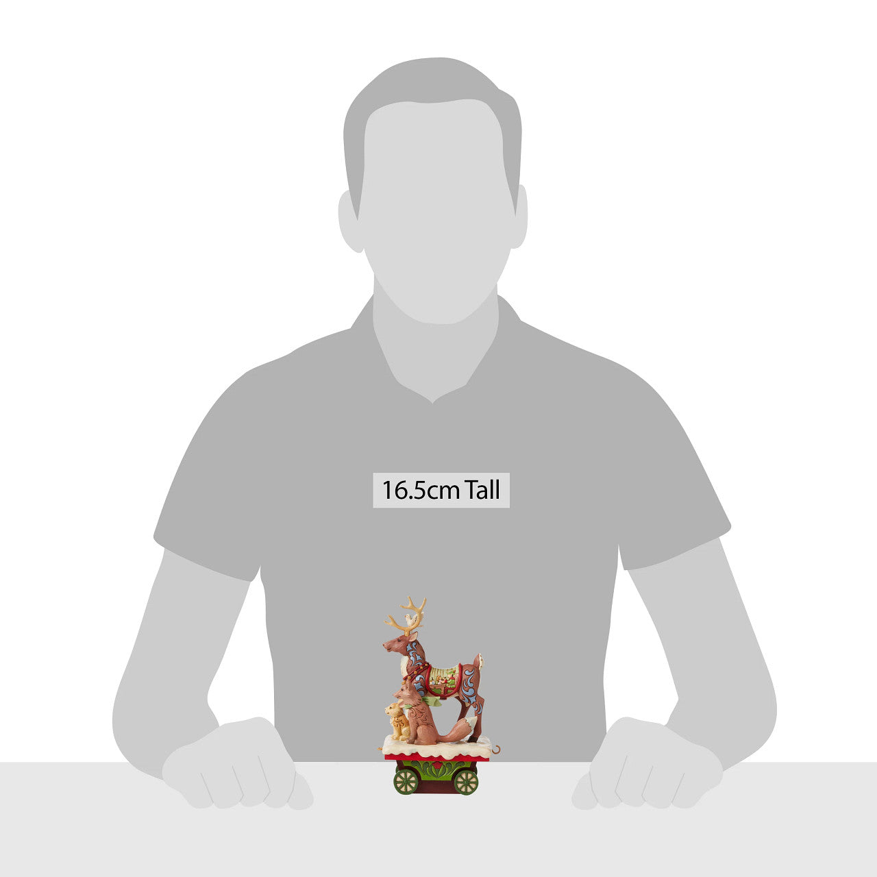 This Jim Shore train car brings friends in tow! A regal reindeer wears a collar of bells and a saddle with a detailed scene of an elf building Christmas toys. A dove rests in the reindeer's antlers, while smaller colorful creatures hitch a ride below.