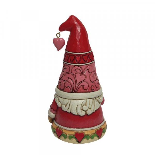 Carrying flowers, this red robed gnome is a vision of affection and fondness. Hat pulled down over his eyes, his cheeks rose with tenderness. Hat and robe rimmed in hearts, this gnome statuette by Jim Shore spreads love wherever he's set.