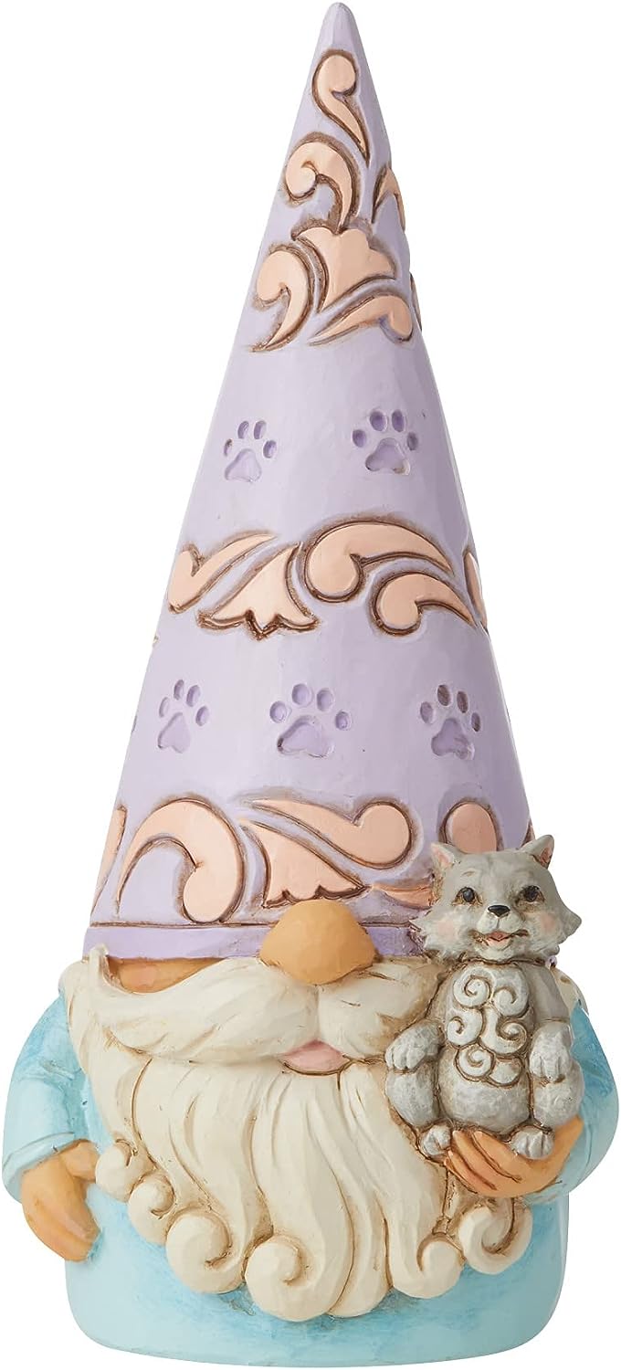 "Purr-fect Gnome" For centuries, gnomes have been symbols of good luck. Often placed in gardens, they are thought to provide protection with their delightful charm. This Jim Shore gnome wears a paw print patterned hat as he cheerfully calms a kitty in his hand.