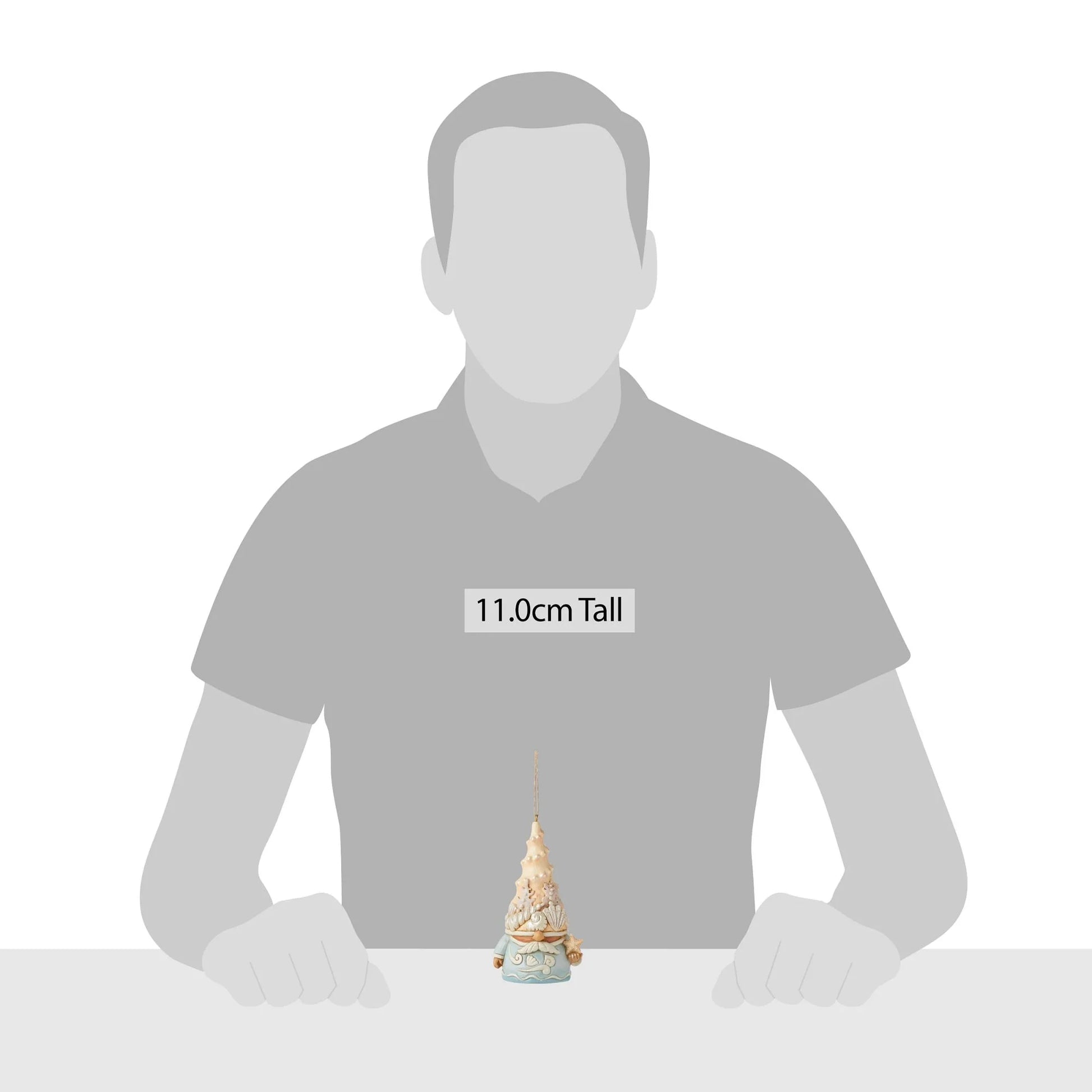 This charming gnome ornament brings a little seaside escape to any winter holiday. Donning ocean inspired robes, he holds a seashell and dons a luxuriously curated hat of shells and pearls. With fashion and humor this gnome delights any home.