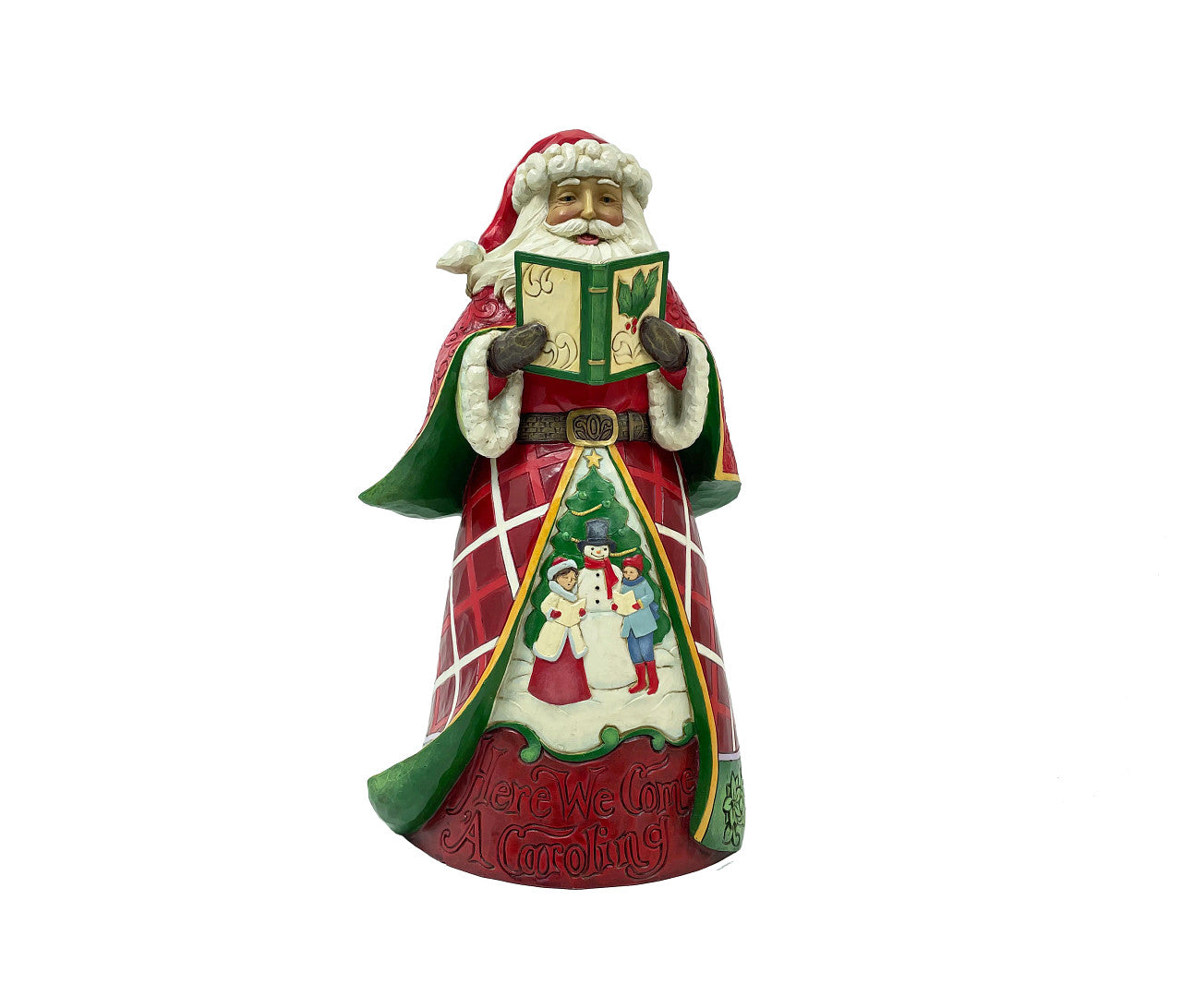 This colorful Jim Shore statuette features a singing Santa with a caroling scene. Santa's billowing patchwork cloak frames two carolers singing beside a snowman and Christmas tree. With luxurious patterns and poinsettias, this figurine is a classic.