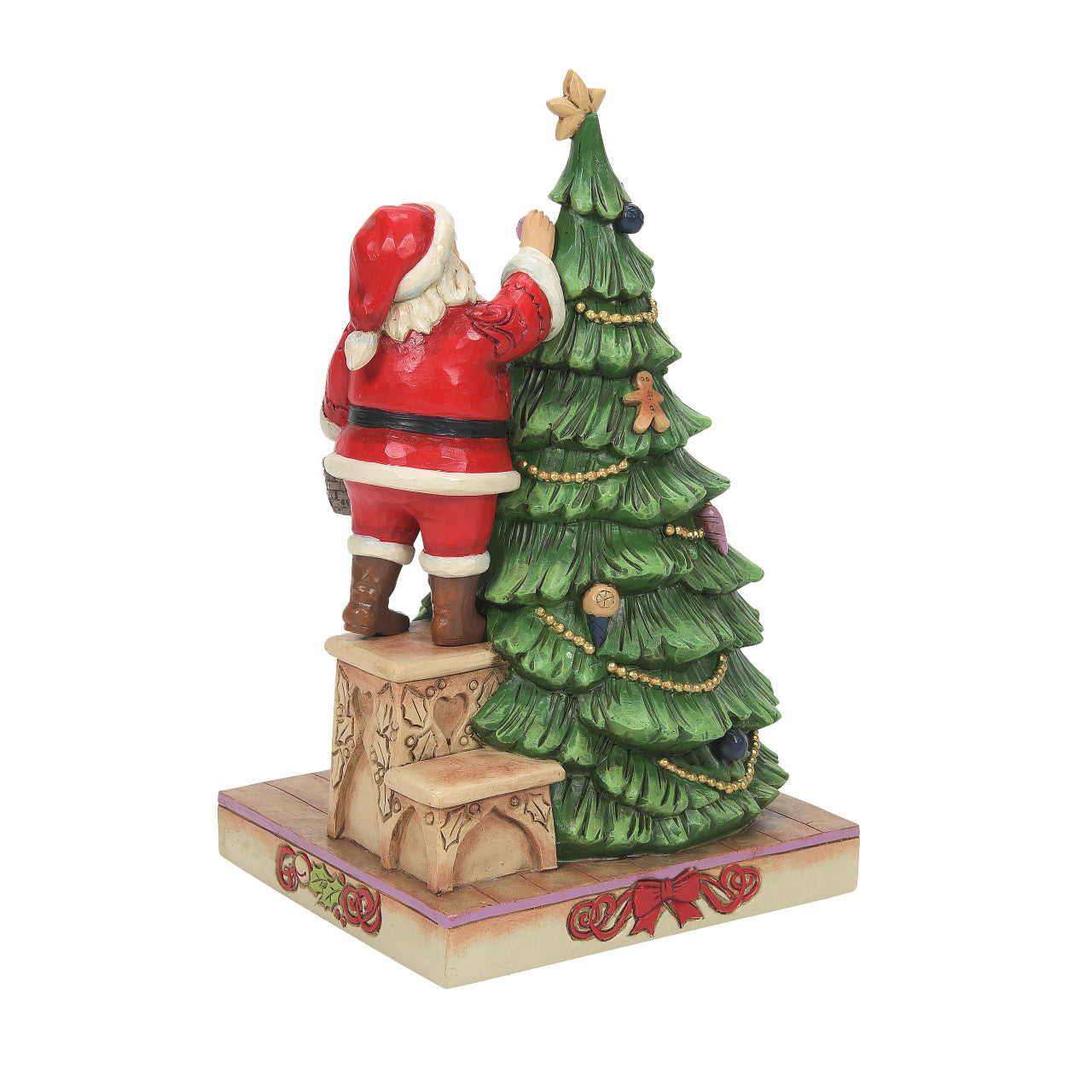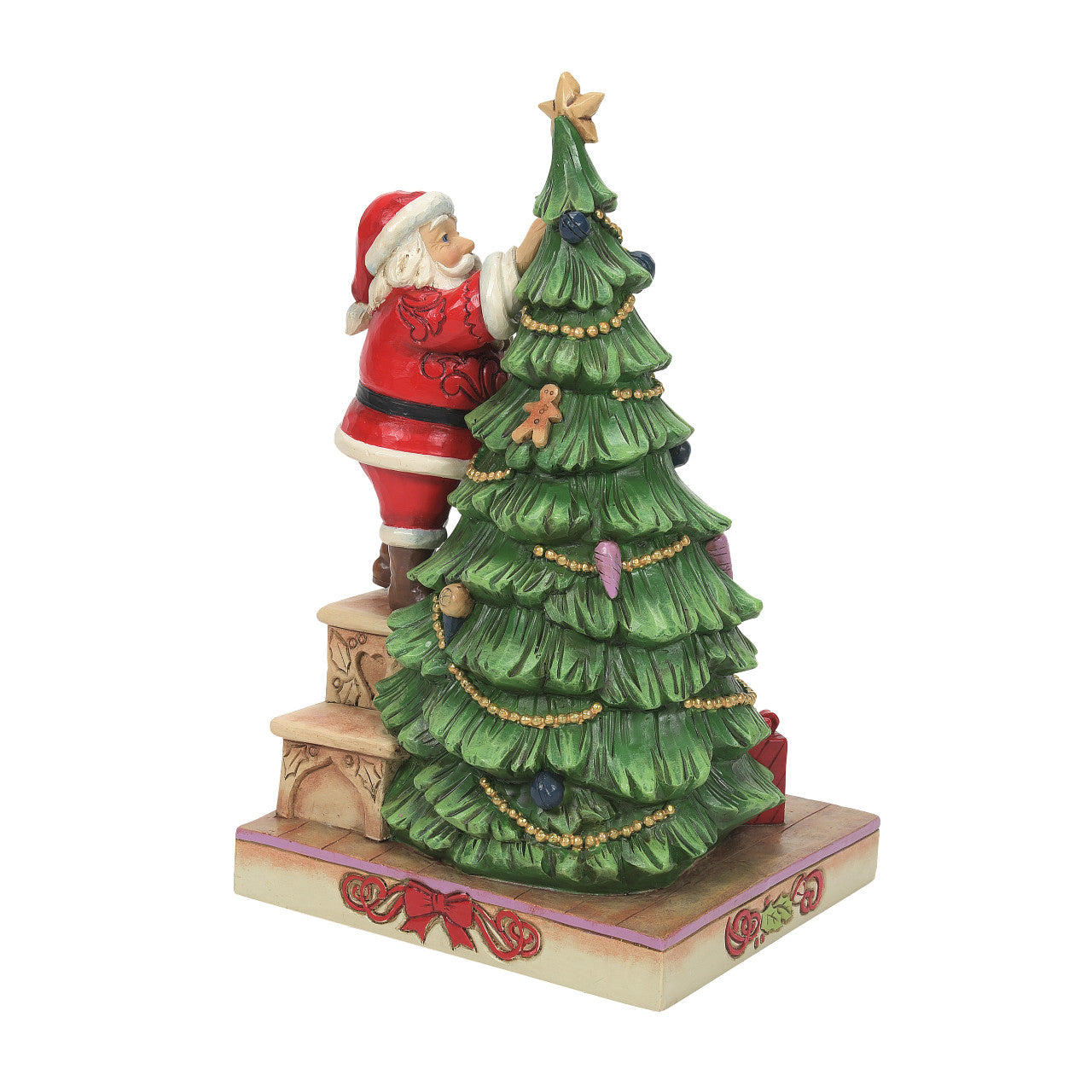This charming Jim Shore figurine features Santa decorating a magnificent tree. Using a step stool, Santa adds ornaments to the towering pine with an excited smile. Santa enjoys every aspect of the most wonderful time of the year.