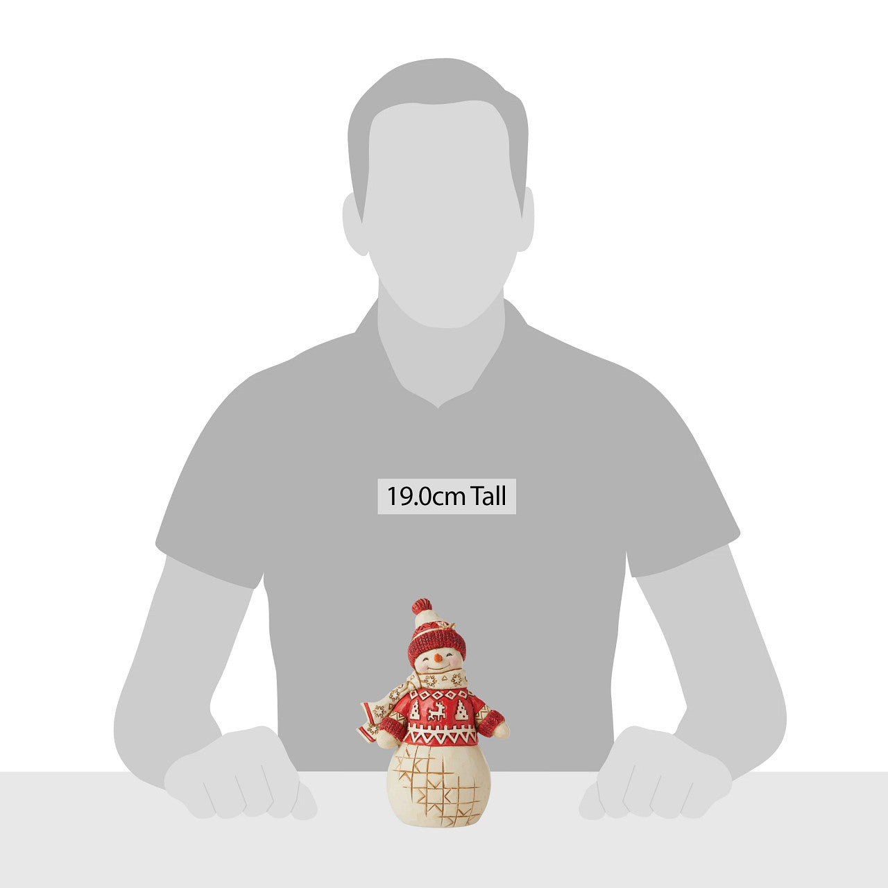 With a lovely presence and carrot nose, you will be greeted with a snowy smile whenever you catch this snowman's eye. Wearing a holly brimmed knit hat, snowflake scarf and Nordic inspired red sweater, this snowman delights with patchwork details.