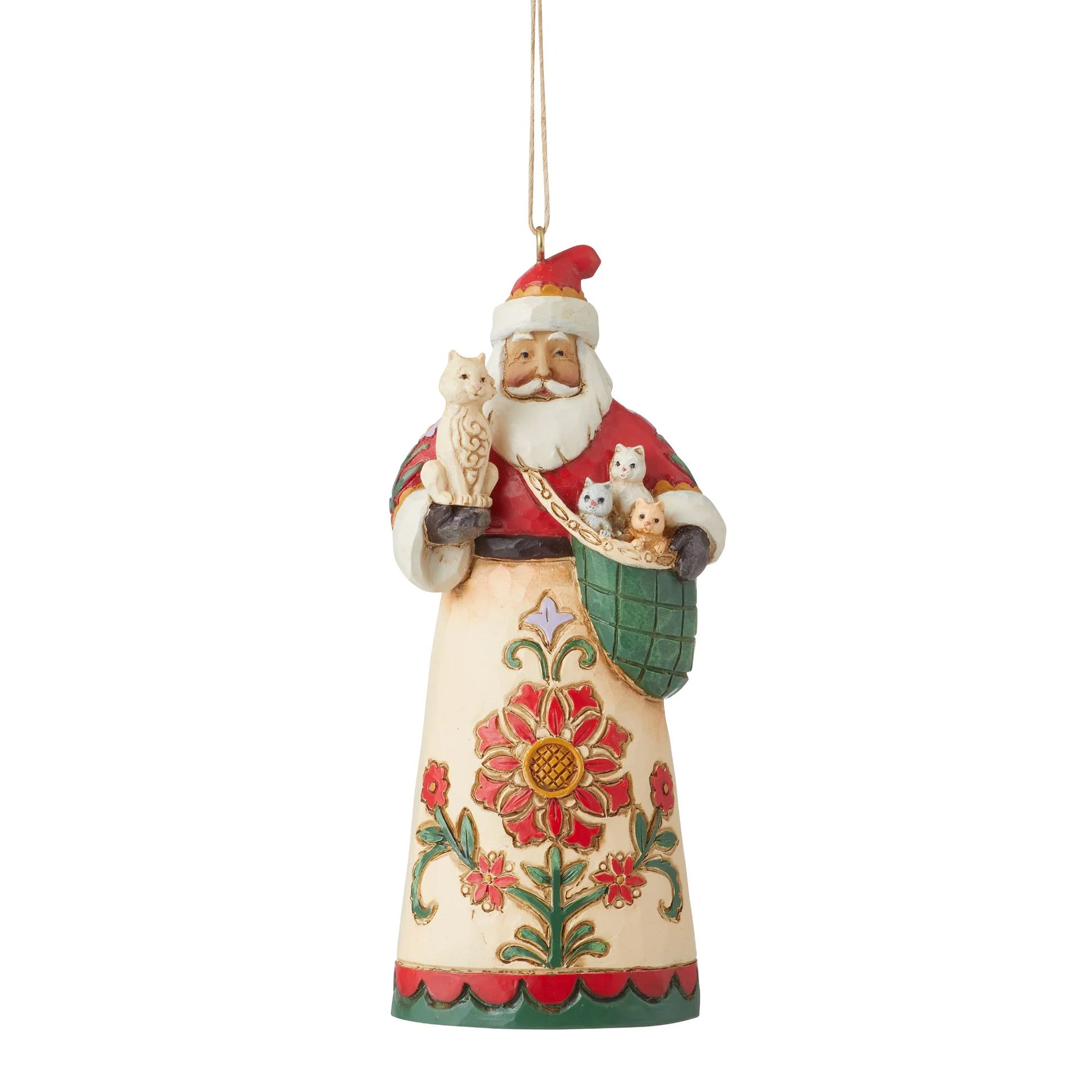 This spectacularly dressed Jim Shore Santa ornament carries a cluster of Christmas cats in his bag. With a floral cloak and holly bag, Santa delivers gifts that keep on giving - and meowing! These festive felines can't wait to join your family.