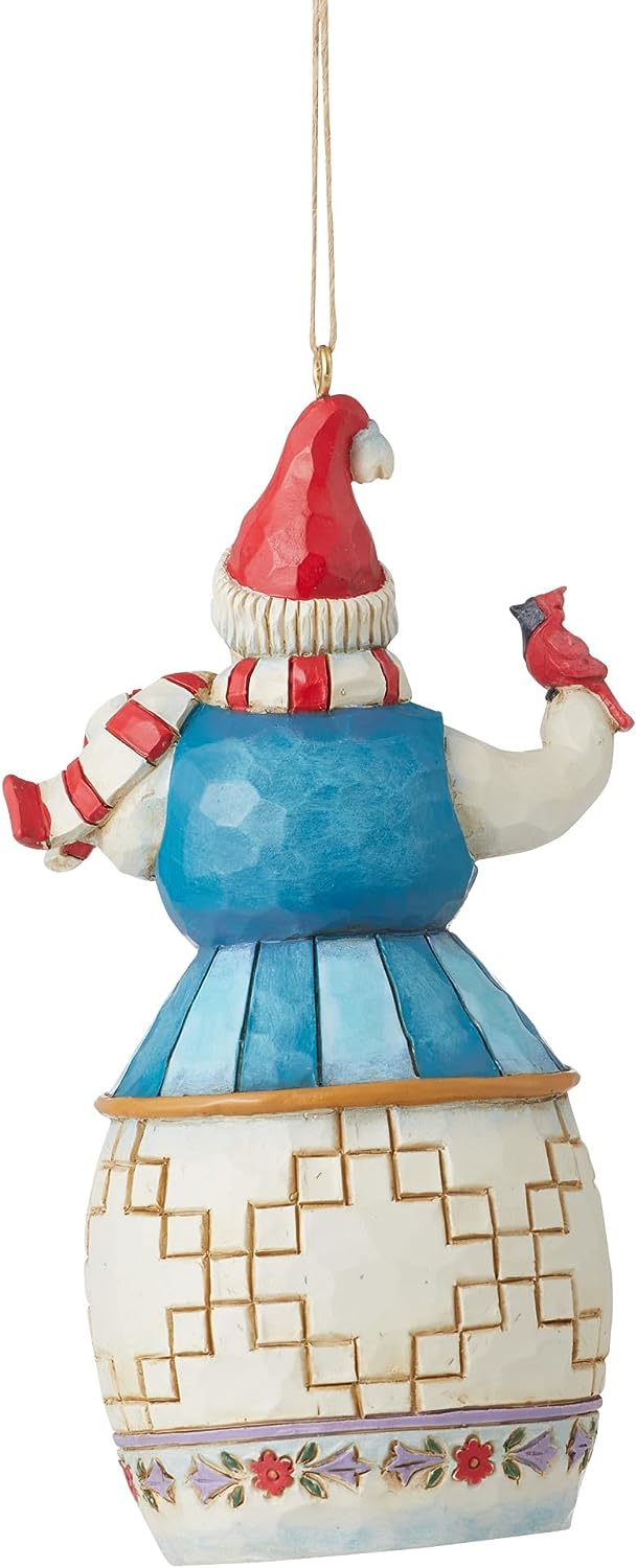 Every Christmas, we surround ourselves with symbols of comfort and joy. Which of these is greater than the humble snowman? This one welcomes winter with a feathered friend. Holding a cardinal, this Jim Shore ornament captivates with color.