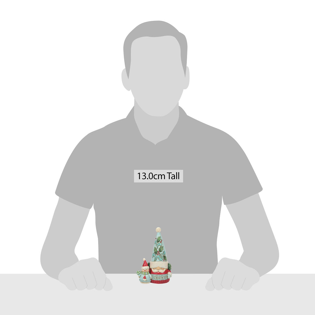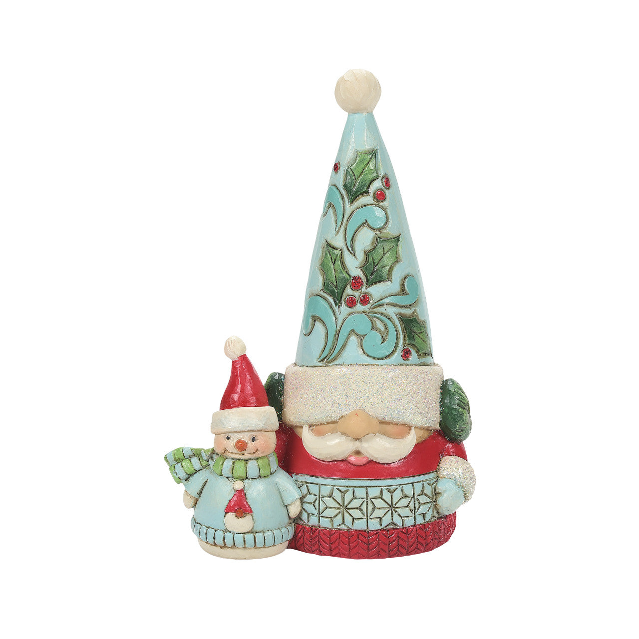 Nobody knows gnomes like Jim Shore. Creating hundreds through the years, each gnome friend is a collectible marvel of charm and craftsmanship. This Wonderland gnome dons a colorful sweater, earmuffs, and hat for winter fun with his snowman friend.