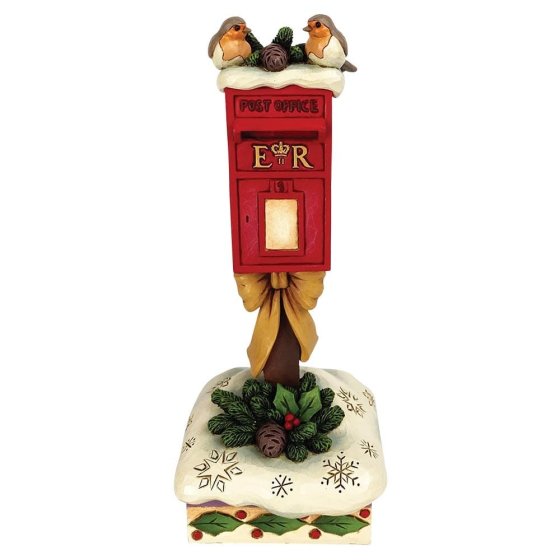 This peaceful Jim Shore figurine features a post office collection box decorated for the season. With a large bow and poinsettia outfitted wreath, snowflakes pattern the box's snow base. Two birds sit a top the box, watching deliveries come and go.