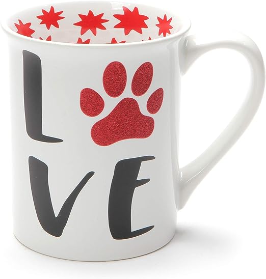 Love Paw mug is a fun and eye-catching way to start your day. It features a glossy finish with a unique glitter paw design to show off your furry friends' love. Message: LOVE, back reads: Love my furry friends