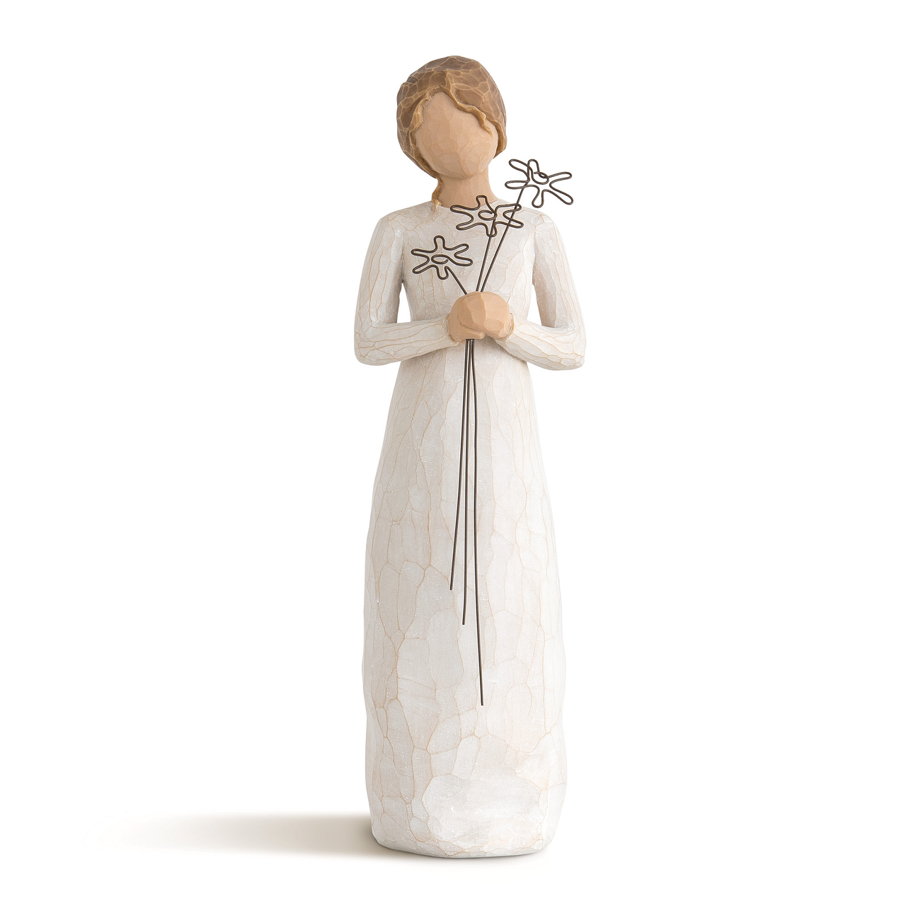 Artist Susan Lordi hand carves the original of each Willow Tree sculpture. Using family and friends as models, Susan tries to capture a moment in time, or express a feeling. Pieces are cast from her original carvings, and then individually painted by hand. Softly washed colours, carved and metal accents, and representative icons of nature mark Susan’s work.