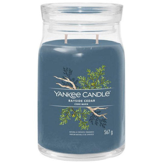 Bayside Cedar. The fragrance notes are as follows: Top: Bergamot, Green Pear, Grapefruit; Mid: Mandarin Blossom, Water Lily; Base: Amber, Cedarwood Musk. A walk along the forest path right after the rain with refreshing notes of grapefruit, mandarin blossoms, and warm amber filling the air. Experience the Yankee Candle brand, totally reimagined. This refreshing take on our iconic Jar shape is designed to create the best experience to date. This is the largest Jar Candle in the collection at 567g. Two wicks and a premium soy-wax blend provide beautiful ambiance. Hand-illustrated labels and vibrant wax colours are perfectly matched with our Signature exclusive and tried-and-true fragrances to create an inspired addition to your home.