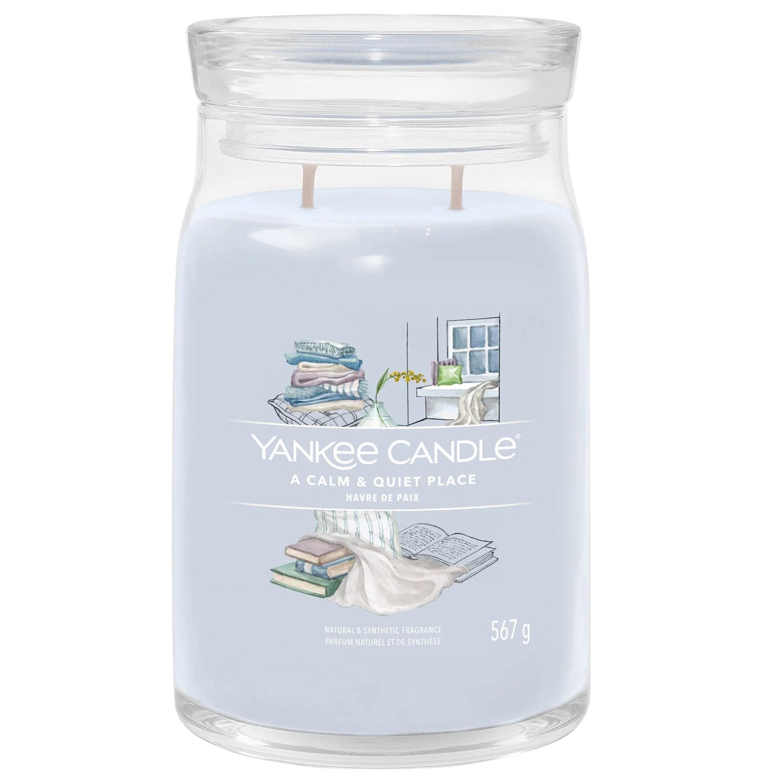 A Calm & Quiet Place. The fragrance notes are as follows: Top: Mandarin Leaf; Mid: Jasmine, Cedarwood; Base: Patchouli, Sandalwood, Amber Musk. A meditative fragrance - balanced and centred with gentle jasmine, a whisper of patchouli and warm amber musk. Experience the Yankee Candle brand, totally reimagined. This refreshing take on our iconic Jar shape is designed to create the best experience to date. This is the largest Jar Candle in the collection at 567g. Two wicks and a premium soy-wax blend provide beautiful ambiance. Hand-illustrated labels and vibrant wax colours are perfectly matched with our Signature exclusive and tried-and-true fragrances to create an inspired addition to your home.